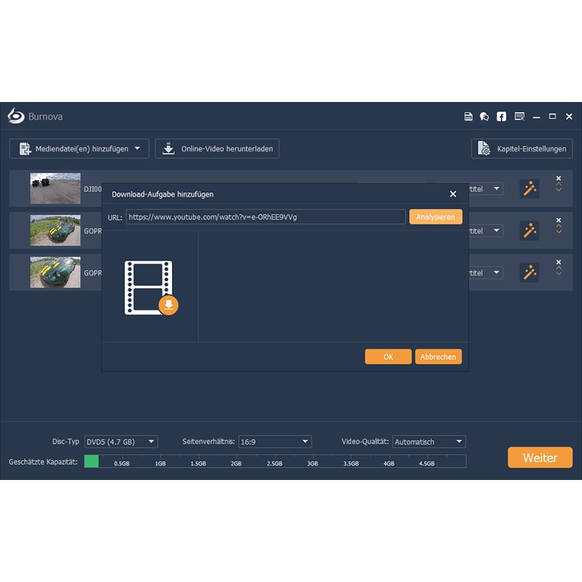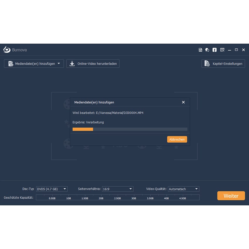 Brennen Sie mühelos Videos von Ihrer Festplatte oder von Websites wie YouTube, Vimeo und Facebook auf DVD & Blu-ray mit Burnova. Erstellen Sie ISO-Abbilder oder DVD Ordner schnell und einfach. Kompatibel mit verschiedenen DVD-Typen wie DVD-R, DVD+R, DVD-RW, DVD+RW, DVD+R DL, DVD-R DL, DVD-5 und DVD-9. Perfekt für Hochzeitsvideos und mehr!