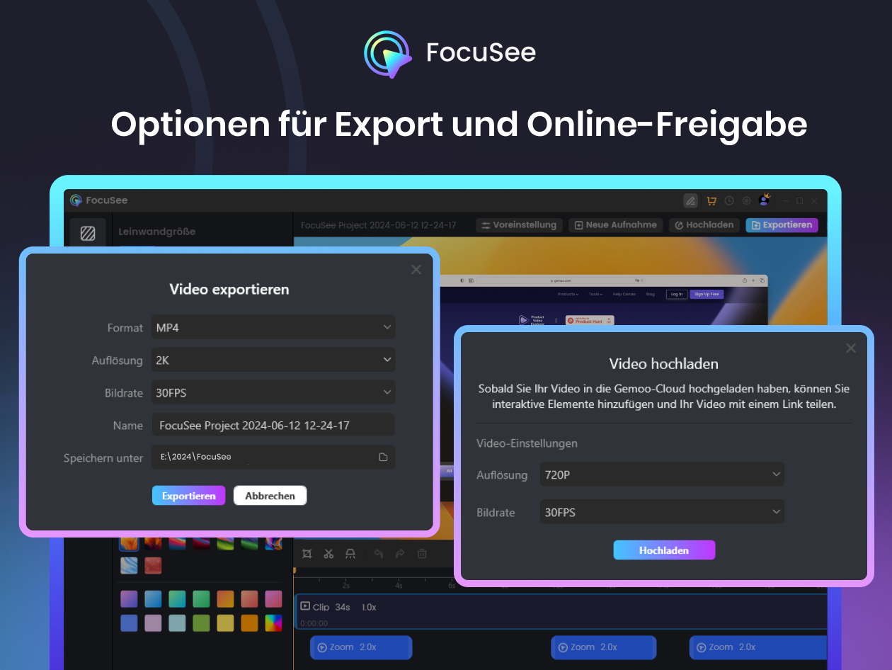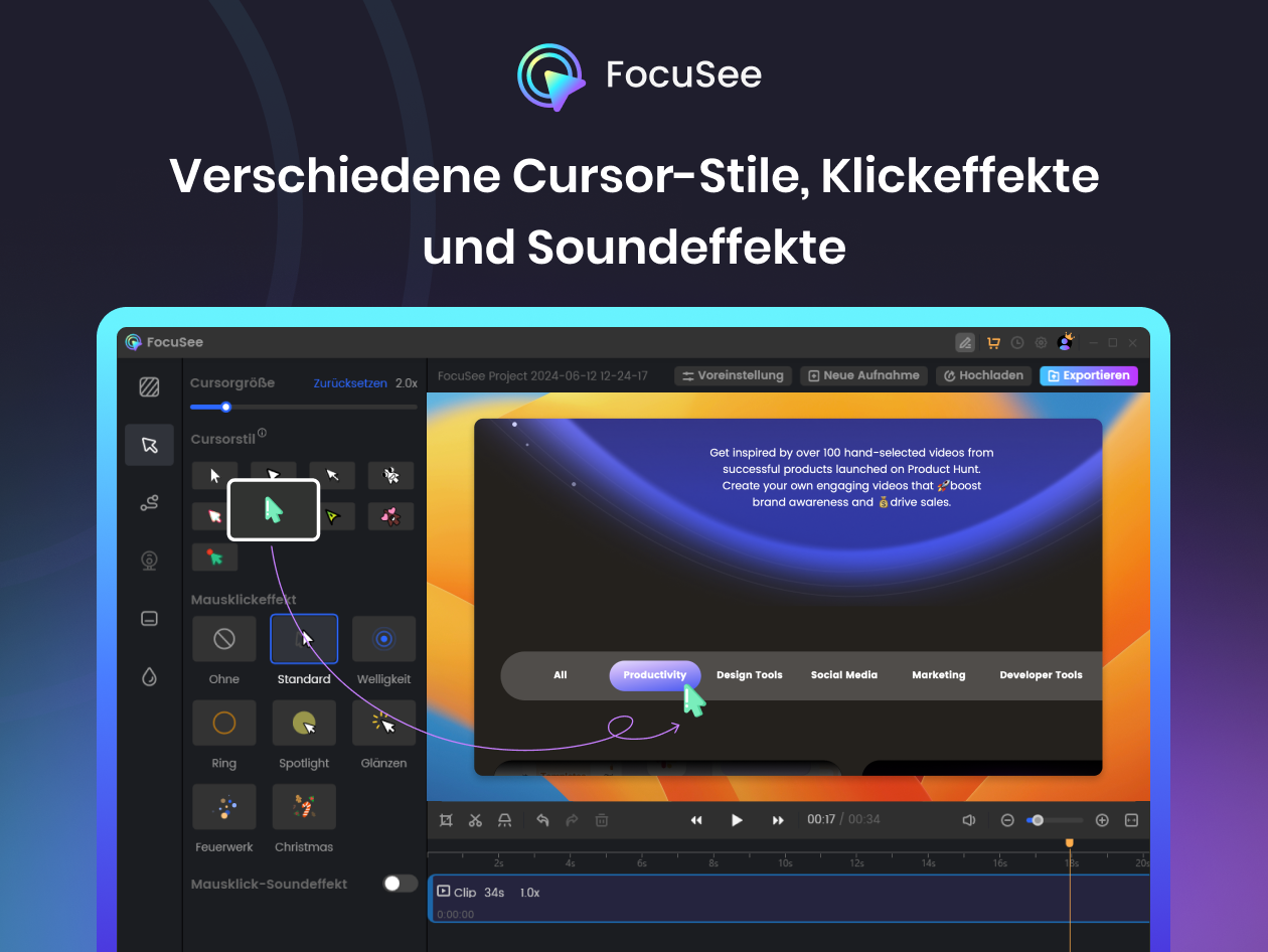 iMobie FocuSee revolutioniert die Bildschirmaufnahme mit intelligenter Automatisierung und professionellen Bearbeitungsfunktionen. Das Tool bietet dynamische Zoomeffekte, präzises Cursor-Tracking und anpassbare Layouts, um Ihre Videos visuell ansprechend und leicht verständlich zu gestalten. Integrieren Sie interaktive Elemente wie Quiz und Formulare direkt in Ihre Aufnahmen. Mit umfangreichen Exportoptionen in verschiedenen Formaten und Qualitätsstufen teilen Sie Ihre Inhalte mühelos auf allen gängigen Plattformen. Ideal für Schulungen, Tutorials und Produktdemonstrationen – FocuSee spart Zeit bei der Nachbearbeitung und liefert sofort einsatzbereite, hochwertige Ergebnisse.