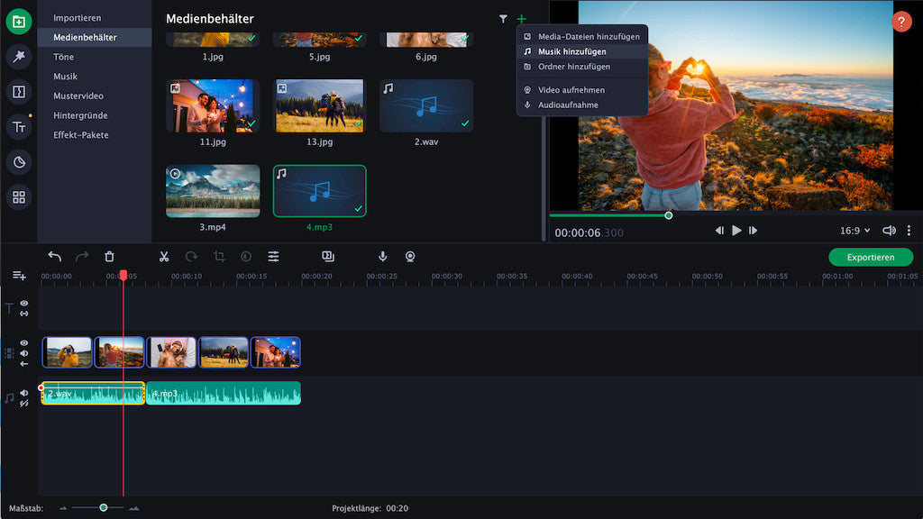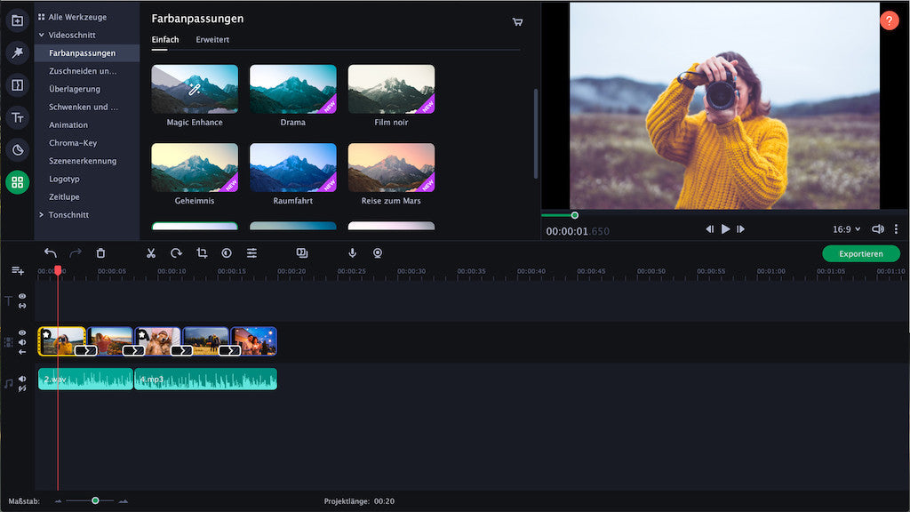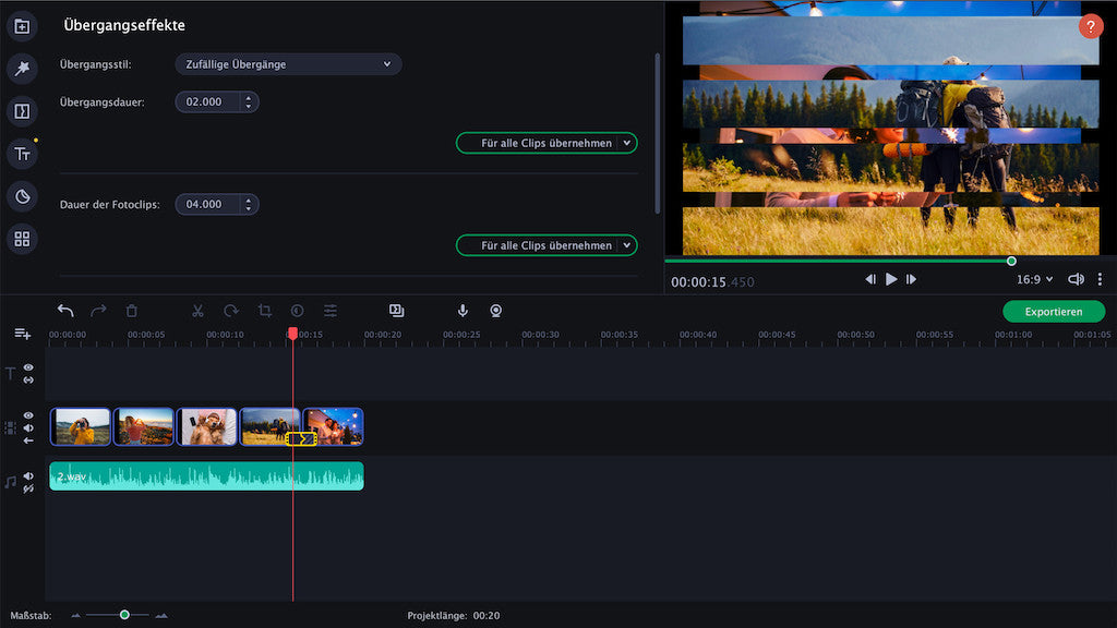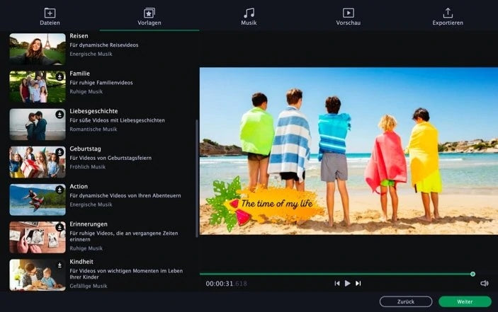 Erstellen Sie mit Movavi Slideshow Maker 2023 ganz einfach beeindruckende Diashows. Das schlanke Design und die intuitiven Werkzeuge machen die Anwendung einfach. Verwenden Sie die integrierten Vorlagen für automatische Diashows und passen Sie diese mit Dutzenden von Titeln, Übergängen und Musikstücken an. Beeindrucken Sie Ihr Publikum mit professionellen und ansprechenden Diashows.