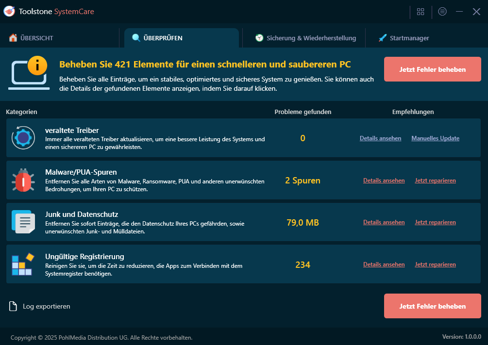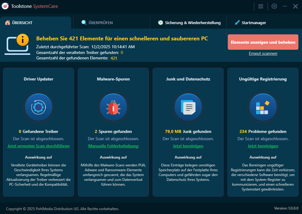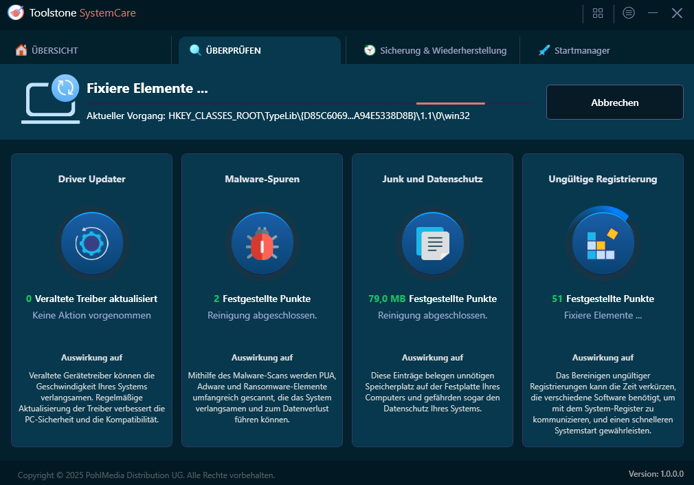 Toolstone SystemCare ist eine umfassende Windows-Optimierungslösung, die Ihren PC durch intelligente Systemverwaltung in Topform hält. Die Software entfernt überflüssige Dateien, optimiert Ressourcennutzung und eliminiert Sicherheitsrisiken durch fortgeschrittene Malware-Erkennung. Mit automatisierter Wartung und benutzerfreundlicher Ein-Klick-Optimierung benötigt Ihr System minimale manuelle Eingriffe. Das Ergebnis: konsistente Leistung, maximale Stabilität und zuverlässiger Schutz vor digitalen Bedrohungen.